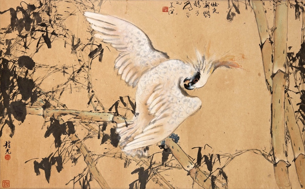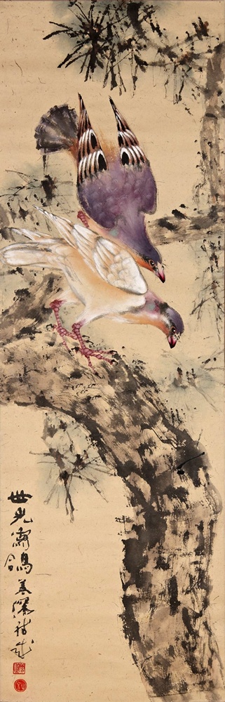父親師承奇峰祖師高足趙少昂,而楊善深先生則屬劍父一脉,故兩人的合作畫正好是劍父、奇峰筆法的拼盤。其中一幀是父親先寫白鸚鵡,楊先生補竹成之。竹竿以雙鈎寫出配合雙鈎鸚鵡,用筆蒼勁老練,竹葉則以深墨寫成而淋漓盡致,能更好地襯托鸚鵡之白,畫成後再由楊先生題記。另一幀由父親寫雙鴿,再由楊先生寫蒼松補成並題記。雙鴿色彩斑斕用筆精細,而蒼松筆法疏落粗獷,在對比強烈中顯出了獨特韻味。總之,兩幀作品在配合兩種筆法和畫風後,都取得了良好效果,讓人耳目一新。