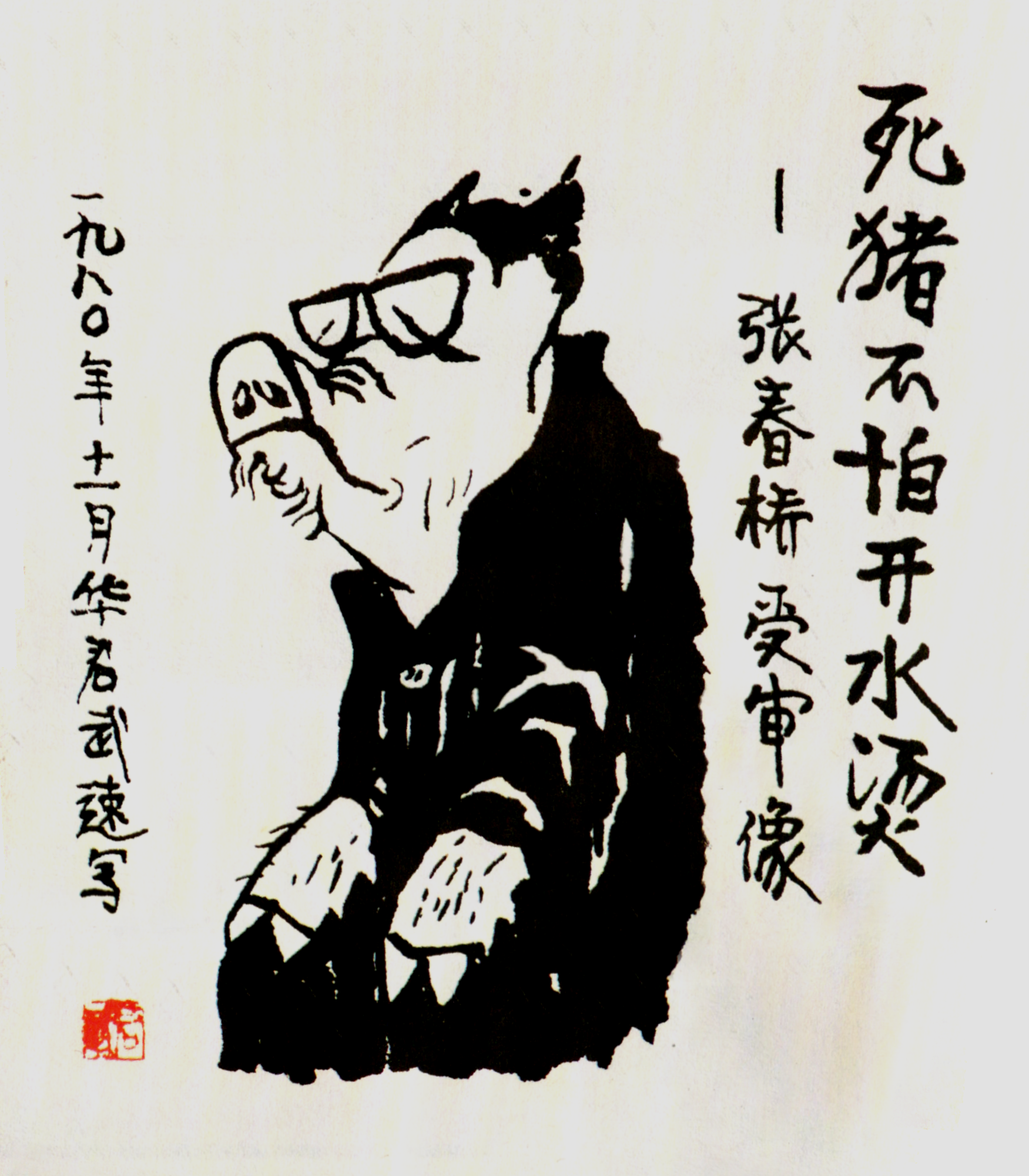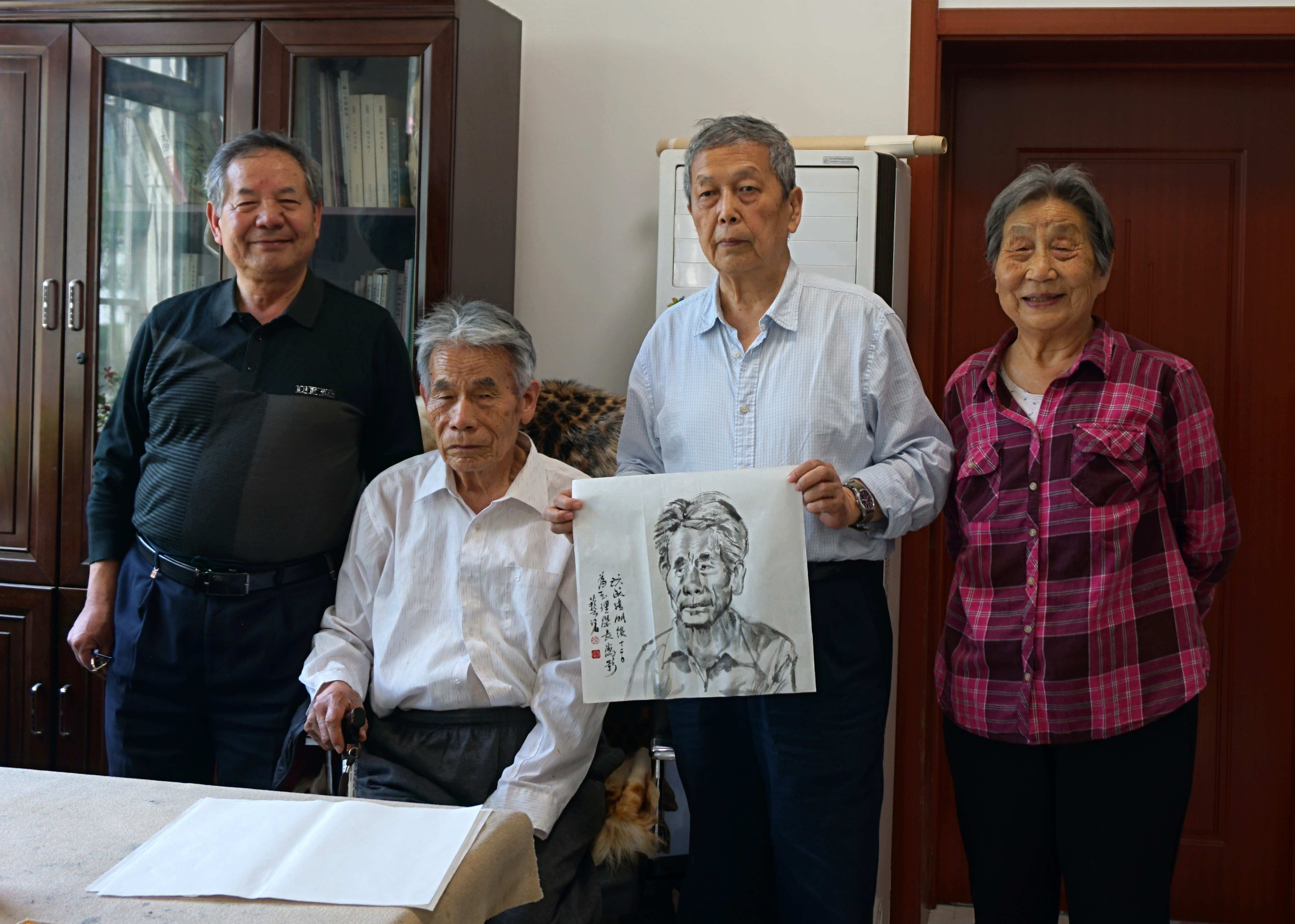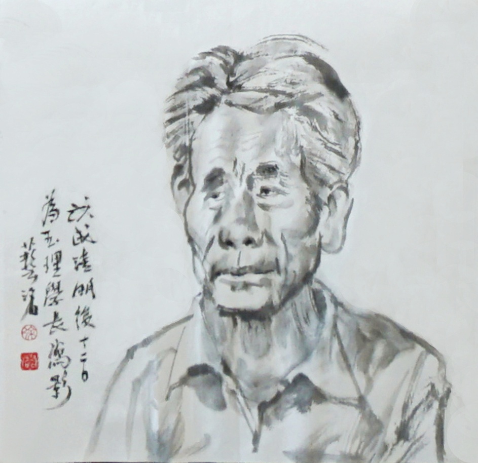 其三,是在石家莊火車站與現居無極縣老同學張承文會合,驅車三小時南下邱縣。地處河北省南部的邱縣早年是貧窮之地。日寇侵佔華北時,也從未進駐其地一兵一卒。由石家莊去邱縣往返需近七小時,只是為了看望年逾八十的陳玉理學兄。陳是我讀天津美術學院雕塑系同班同學(夫人李青艾當年在學院幹訓班就學) ,入學前已是全國著名農民漫畫家,書法也甚有心得。如今他右手麻痺,思維退化,令人感傷。故而,即場為其速寫一幅。彈指四十載,不甘近顏,難追舊貎。畫畢意猶未盡,再寫一幅《勇者勝》相贈留念。