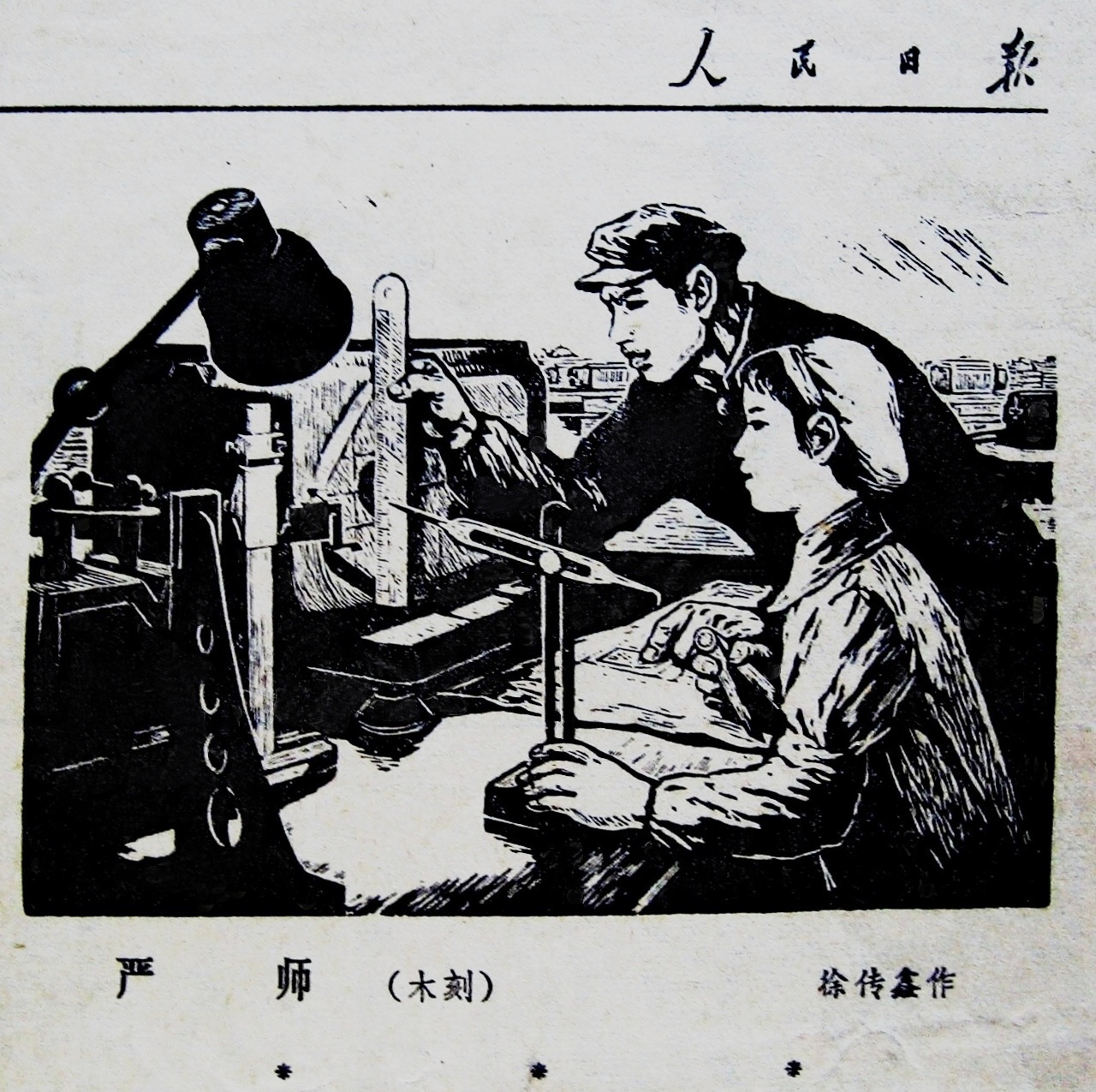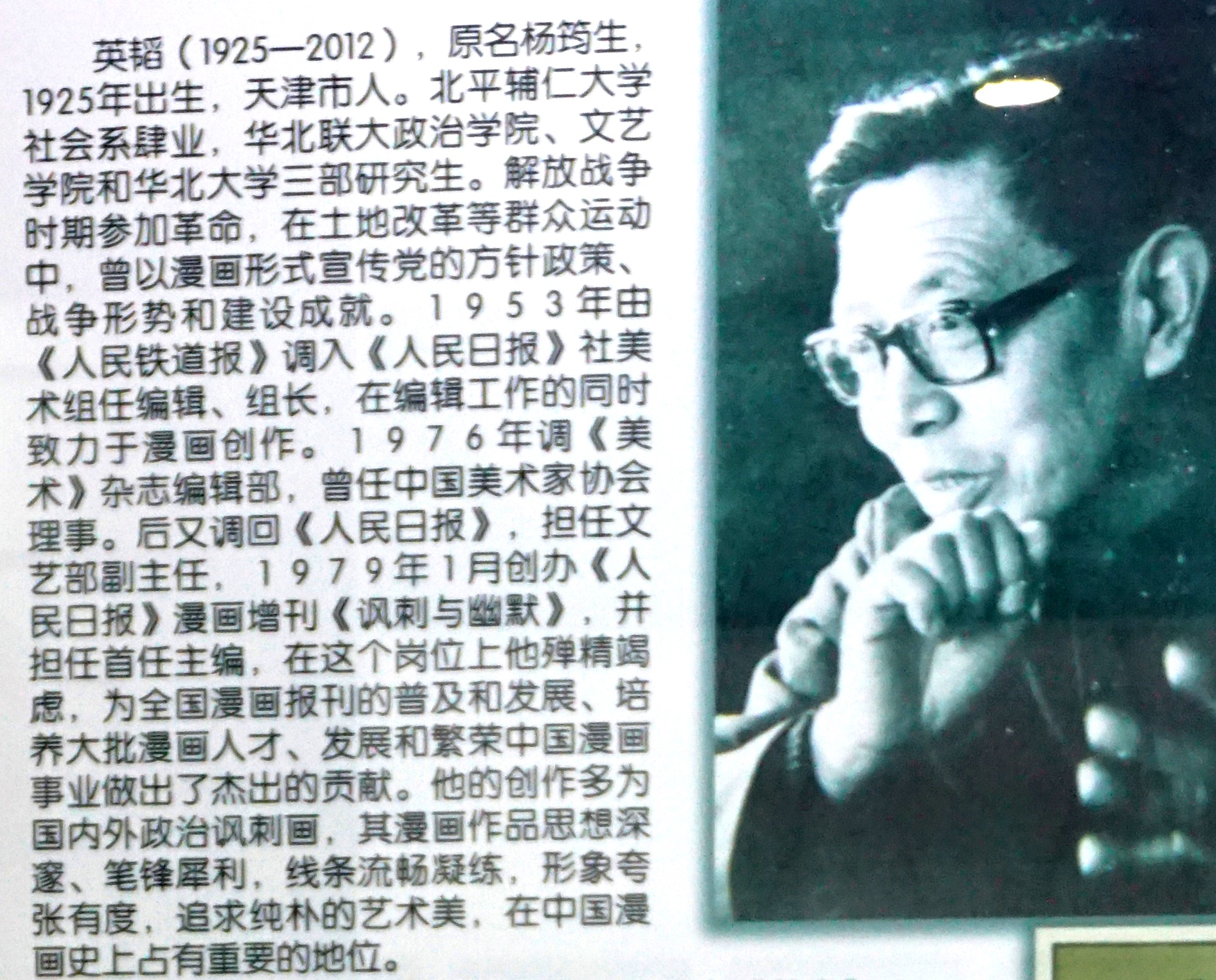 多年來夫妻二人以陳與李為筆名,創作不輟。,聞名漫壇,影響廣泛。並培育了一大批青年作者,成立了邱縣青蛙漫畫組,受到華君武、英韜等漫畫界前輩器重和支持,組建了甚具規模的全國漫畫基地。在參觀華君武、英韜紀念廳時,一個多年縈迴心田的問號,郤在這次遠行中得到答案。七十年代中,天津美協版畫創作組推介給人民日報一批天津版畫家新作,結果只有本人(描繪嚴師出高徒的工業題材)拙作被選中,單獨刊載在人民日報某版右上角,表明作品在「過五關」的審稿中得到美術部編輯和美術部主任,繼而是版面欄目主任、執行總編輯和社長的認同和贊許。多年來我最想知道當時的美術編輯是誰,屈指五十年,還會有答案嗎。絶未想到的是,英韜紀念廳裡一塊有關英韜的簡介展板上,有「一九五三年至一九七六任職人民日報美術部」的記載。古語曰「心想事成」,更有「三尺頭上有神明」之說,此可謂明証特例。英韜的青眼高見對我影響巨大而深遠。事過未過一年,劉品青把我另一幅版畫放在天津文學雜誌訂閱宣傳單張上,經郵局飛到人民日報,結果又被選中刊出。編者與讀者互不相識,完全是「以畫論,而不以人論」。